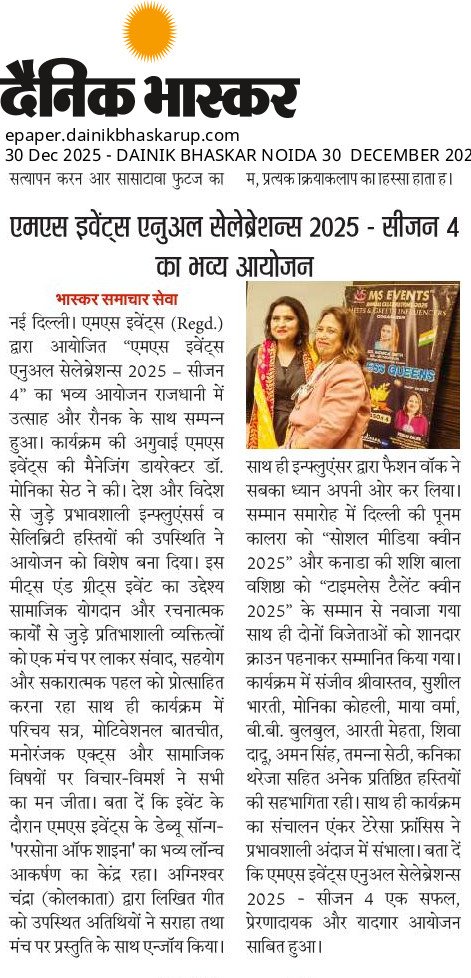 कुल मिलाकर, एमएस इवेंट्स एनुअल सेलेब्रेशन्स 2025 – सीज़न 4 एक अत्यंत सफल, प्रेरणादायक और चर्चित आयोजन के रूप में सामने आया, जिसने सामाजिक सरोकार, मनोरंजन, फैशन, संगीत और नवाचार को एक सशक्त मंच प्रदान किया।